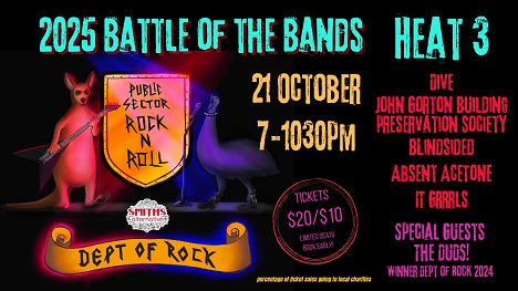 The DUDS came together when someone thought: ‘If I hold a competition for APS musicians, what would a band of compete DUDS look like’. And so, the DUDS were born! Playing their brand of acoustic punk that’s full of attitude but not hard on the ears, the DUDS like tell it like it is – and how it was in the good ol days of the public service. Runners up in 2023 and winners of Dept of Rock in 2024, the DUDS are back this year as our special guests in heat 3. Don’t miss the chance to be dudded once by Canberra’s finest shit stirrers.