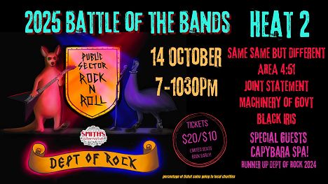 Come cheer on cool public servant rockstars as they ditch their laptops and lanyards for guitars, drumsticks and mics in the ultimate battle for rock supremacy. This year we’ll also be entertained by some very special guest bands and Madam Secretary musings, games and giveaways.