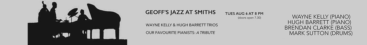 We welcome Geoff Page’s long running jazz series to Smith’s. On a Tuesday night, parking is fairly easy to find in the nearby Magistrates Court car park. If you’re after dinner prior to the show, we’ve negotiated discounts for ticket holders at both Lemongrass Thai (on London Circuit, $25 entree and main, Ph: 6247 2779) and Briscola Italian (next door to Smith’s, 10% discount on anything – Ph: 6248 5444). Grab an early bite at either and head over to Smith’s for the jazz at 8pm. Bookings essential. Print out your tickets or better still have them for show on your phone.