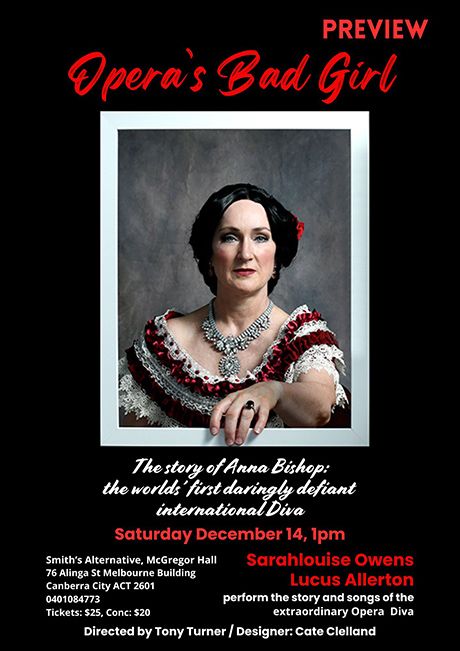 Darling of the goldfields, Anna Bishop returns to Australia, and with her talented pianist, invites you to relive her exciting adventures as she sings the songs that made her fame. Her real life makes for a ripping yarn.
