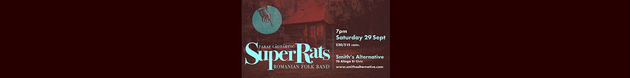Canberra's own Romanian folk band "Super Rats" return to Smith's to lay forth an intriguing smorgasbord of songs and instrumentals from the plains of Wallachia. At the centre of their sound is the cimbalom, a giant dulcimer with 145 strings, clattering along with accordion, violin and double bass. A true curiousity, unique in the Canberra (indeed Australian) music scene! Transport yourself (temporarily) to some kind of Wes Anderson-ish eastern-European bar-room scene, where you are surrounded by an immaculately-disheveled congregation of wise fools and mad geniuses, and let Super Rats provide the soundtrack. Or if you are of a more sober and intense mindset, revel quietly, though perhaps no less jovially, in the accuracy of their authentic mordents.