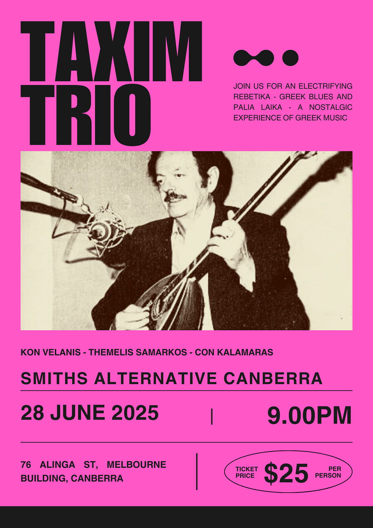 Join us for an unforgettable evening of Rebetiko music at Smith’s Alternative featuring the talented trio of Kon Velanis, Themelis Samarkos, and Con Kalamaras. Rebetiko, often referred to as the "Greek blues," is a genre rich in history and emotion, blending the traditional sounds of Greece with influences from the Middle East and Europe. Musicians: Kon Velanis, Themelis Samarkos, Con Kalamaras.